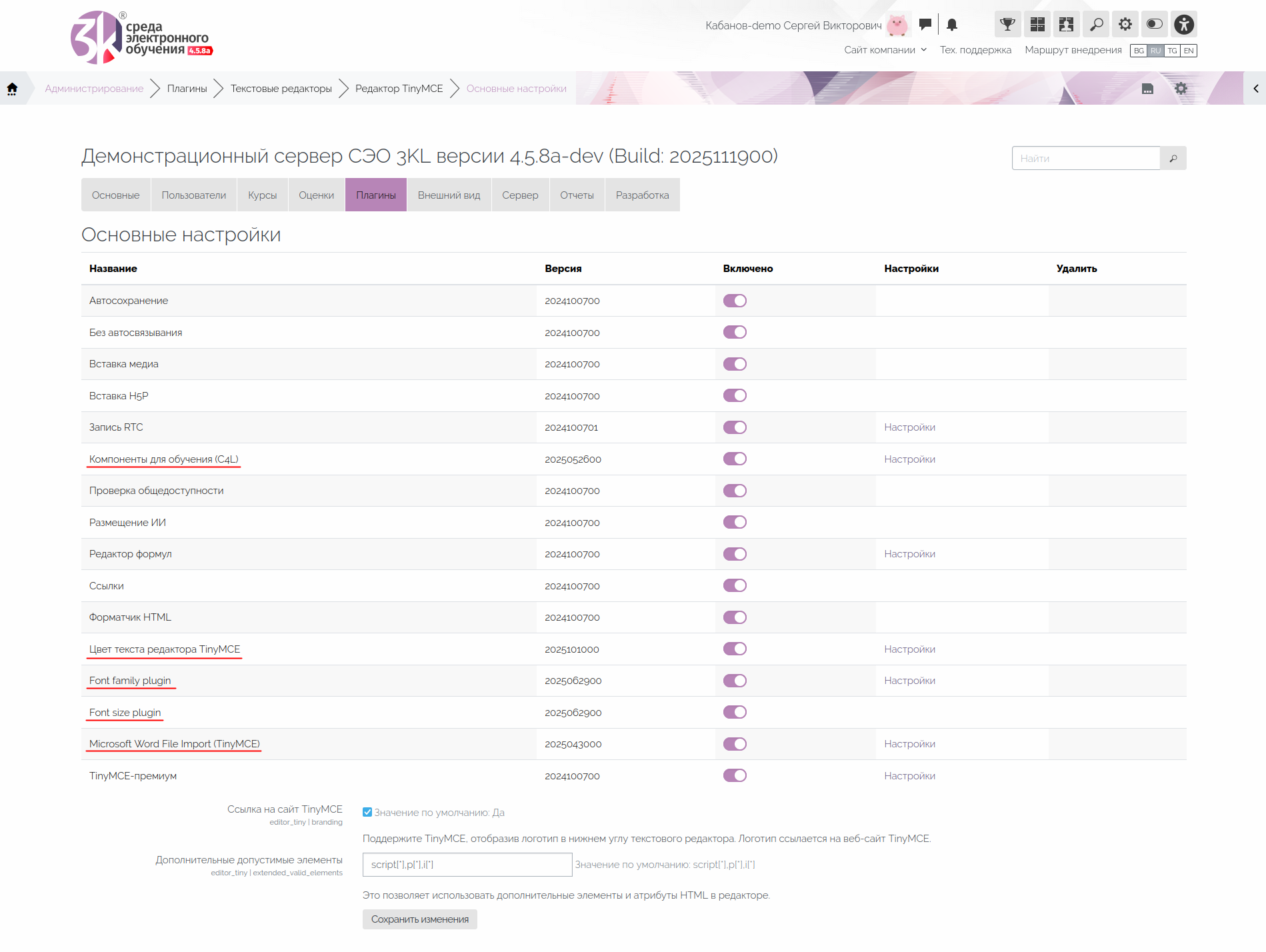 • Для встроенного редактора «TinyMCE», используемого в версии 4.5 как редактор по умолчанию, расширен набор инструментов оформления текста за счет добавления дополнительных подплагинов: