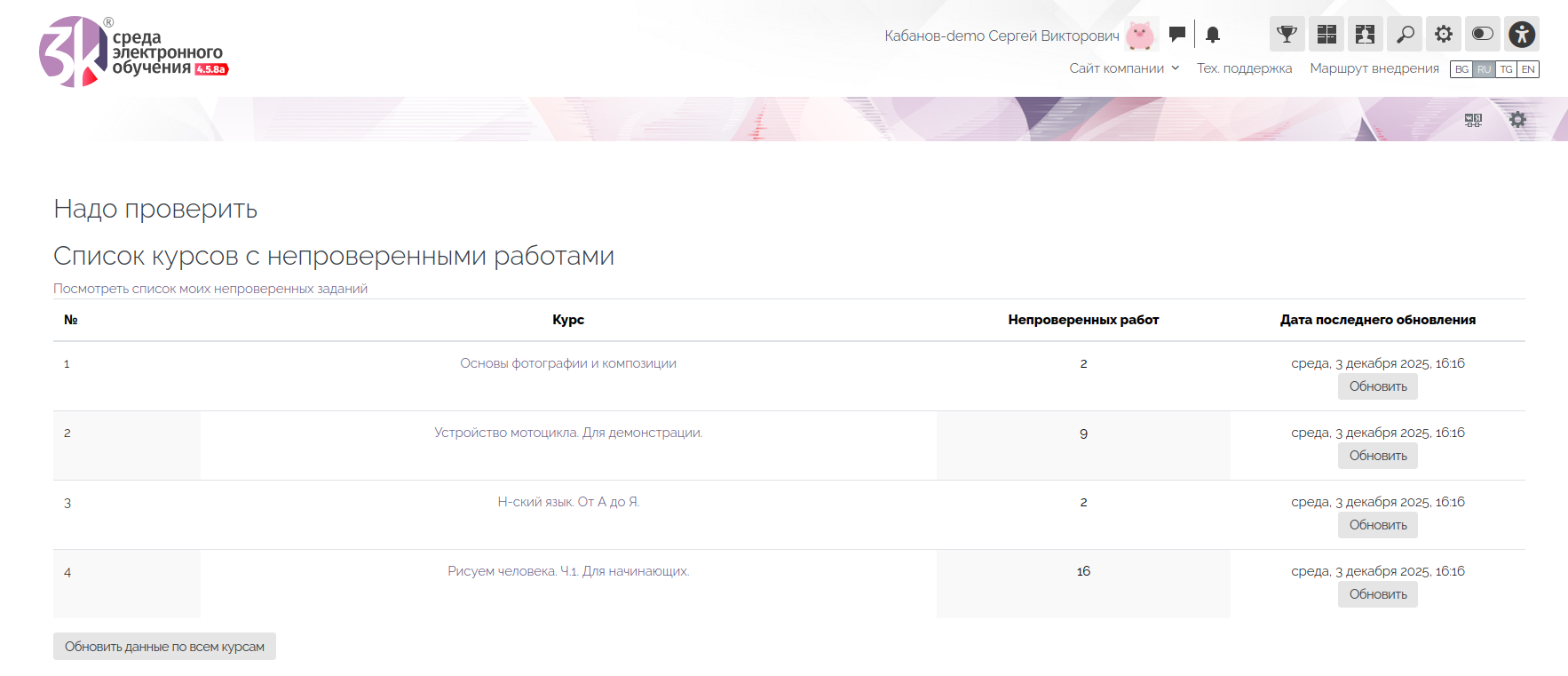 • В блоке «Надо проверить 3KL» повышена производительность автоматического пересчета количества непроверенных работ. В интерфейсе «Список курсов с непроверенными работами» добавлены инструменты для ручного обновления количества непроверенных работ (как в отдельном курсе, так и по всем курсам сразу).