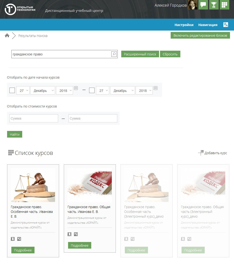 Добавлены быстрые фильтры в «Витрине курсов». Быстрые фильтры позволяют пользователю отобрать интересующие его курсы по параметрам прямо на странице просмотра витрины курсов.