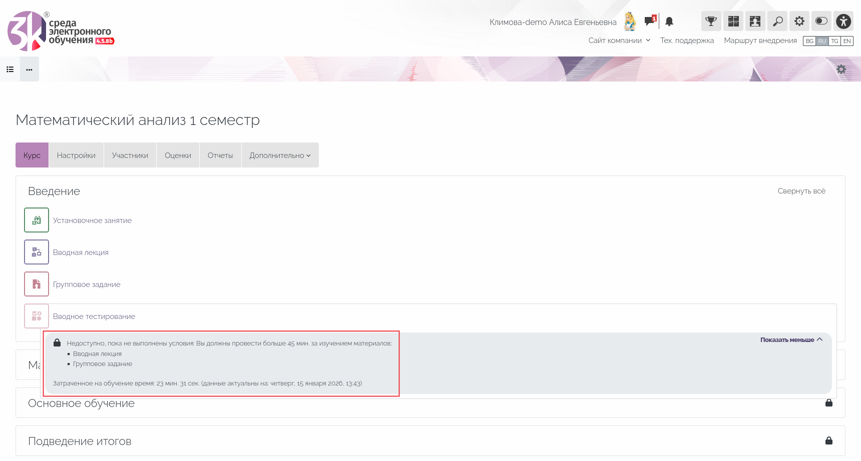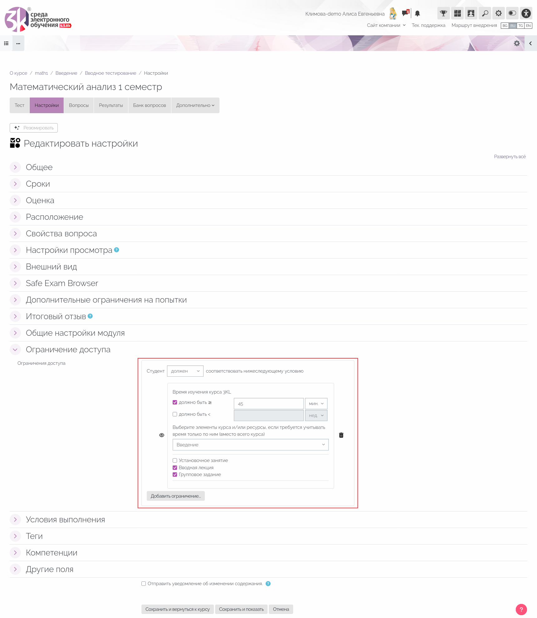 В плагин ограничения доступа «Время изучения курса 3KL» добавлена возможность выбора элементов курса и ресурсов курса, суммарное время изучения которых будет учитываться при ограничении/предоставлении доступа к другому элементу курса или ресурсу.